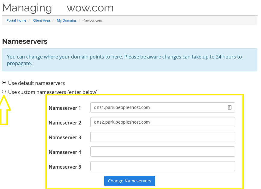- Customize Nameservers: Opt for custom nameservers and input your desired nameservers.